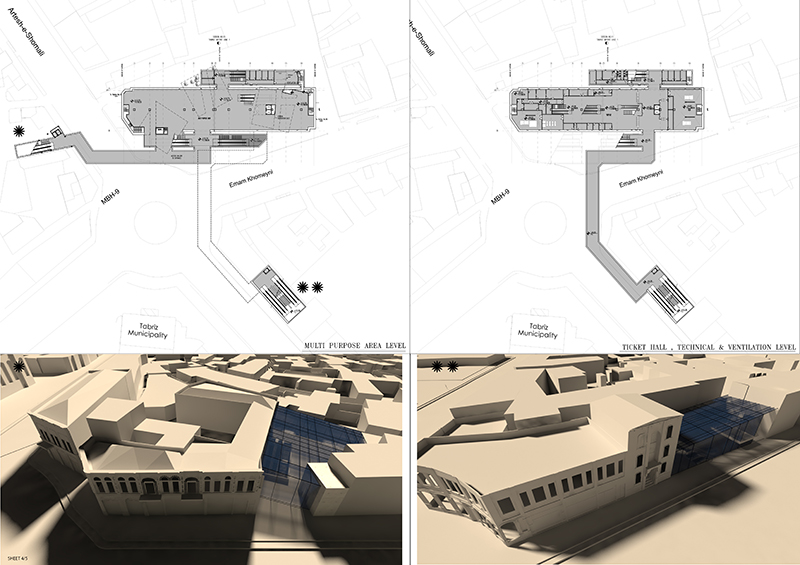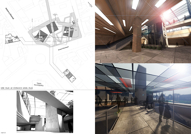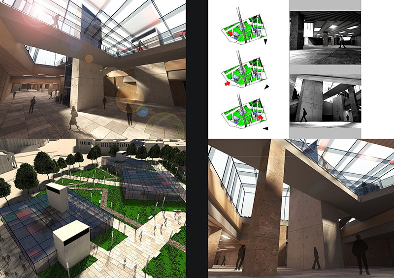 The general definition of space in a metro station is to be detached from outdoor area and being surrounded underground which needs to be reached by leaving the open area and dive deep. This proposal challenges this idea and seeks to bind ground and underground and revive human connection among those who use the subway services and those who just walk through the site. This connection in the first underground level (multipurpose hall), where its cultural nature and commercial values are outstanding, is quite important because it can somehow welcome those who is not even willing to use the subway transportation to experience the area. These communication corridors are shaped like a glass cubical, sinking in the ground, forcing the spectators to investigate the object and the relevant space. These transparent boxes are not just an entrance gate to the subway station but an urban experience to both the people who is using this service and those who just stepped in an important urban area.
