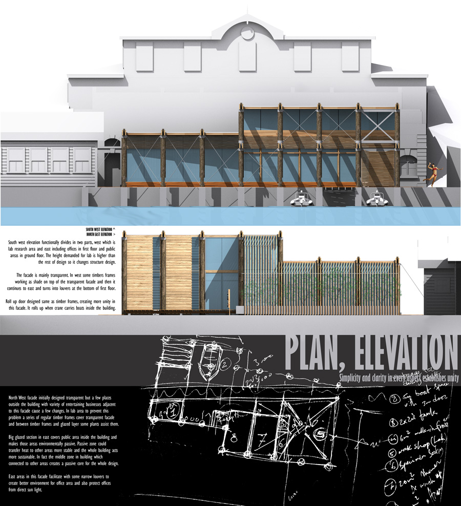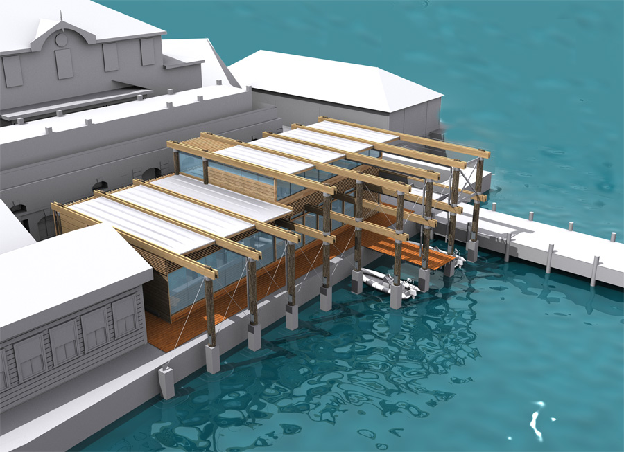 1. GENERAL WORKSHOP SPACE 2. AQUARIUM TANKS 2 x 2000 Lit. 3. STORAGE AREA 4. WALK IN FREEZER 5. SHOWER AND WASH UP AREA 6. SPACE AND SUPPORT FACILITIES TO STORE AND MAINTAIN BOATS 7. OFFICES